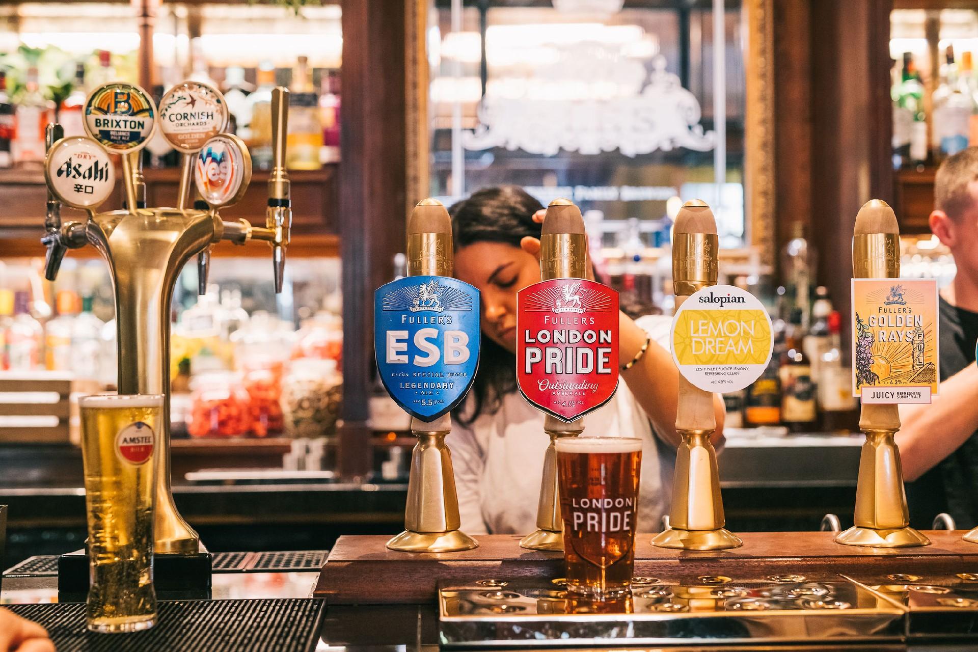 We have no fewer than five hand-pulls at the bar, with London Pride, joined by regularly changing ales. There’s also the opportunity to enjoy some of Fuller’s rarer beers here, with vintage ales for sale and the sumptuous London Porter available as well.